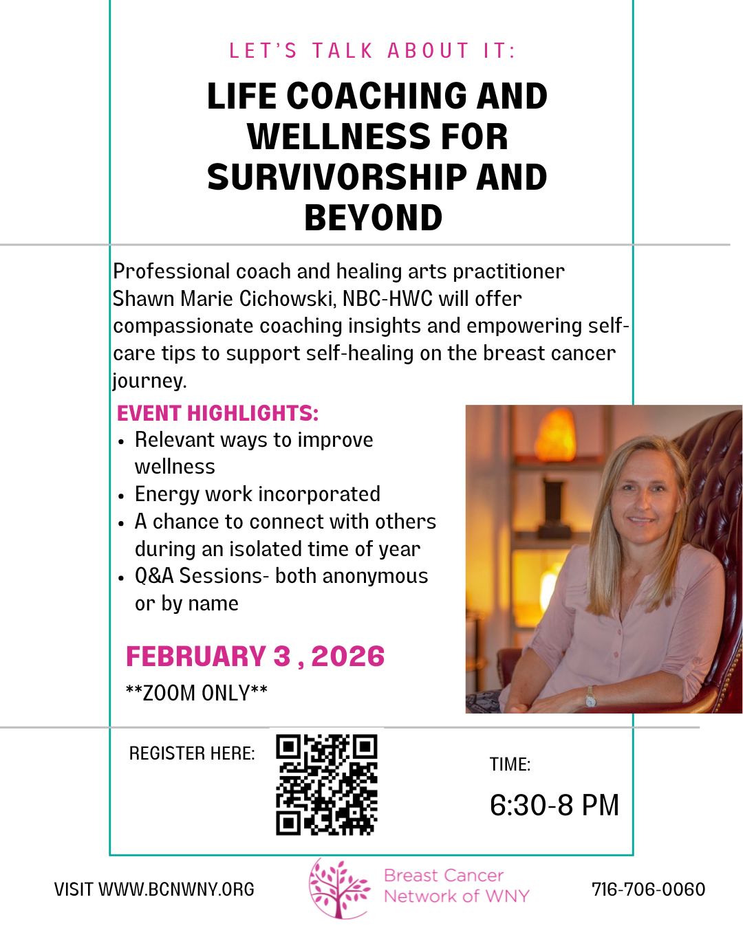 Starting in August 2025 our Let’s Talk About It! seminar series will take place quarterly on the 3rd Tuesday of the month on Zoom. A local doctor or practitioner will deliver a talk about a variety of topics relevant to breast cancer survivorship, including a Q and A at the end.